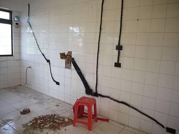 泥作把該補的地方補完之後, 水電也在同時間開始進場點位