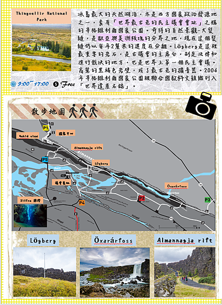 出國前做功課的導覽手冊for 議會國家公園~本來希望裡面照片都可以換成自己拍的, 結果還是缺了個瀑布, 不過說起來這也不會是第一個被pass的景點~真要全部收集完大概可能要在冰島待一個月吧!哈哈