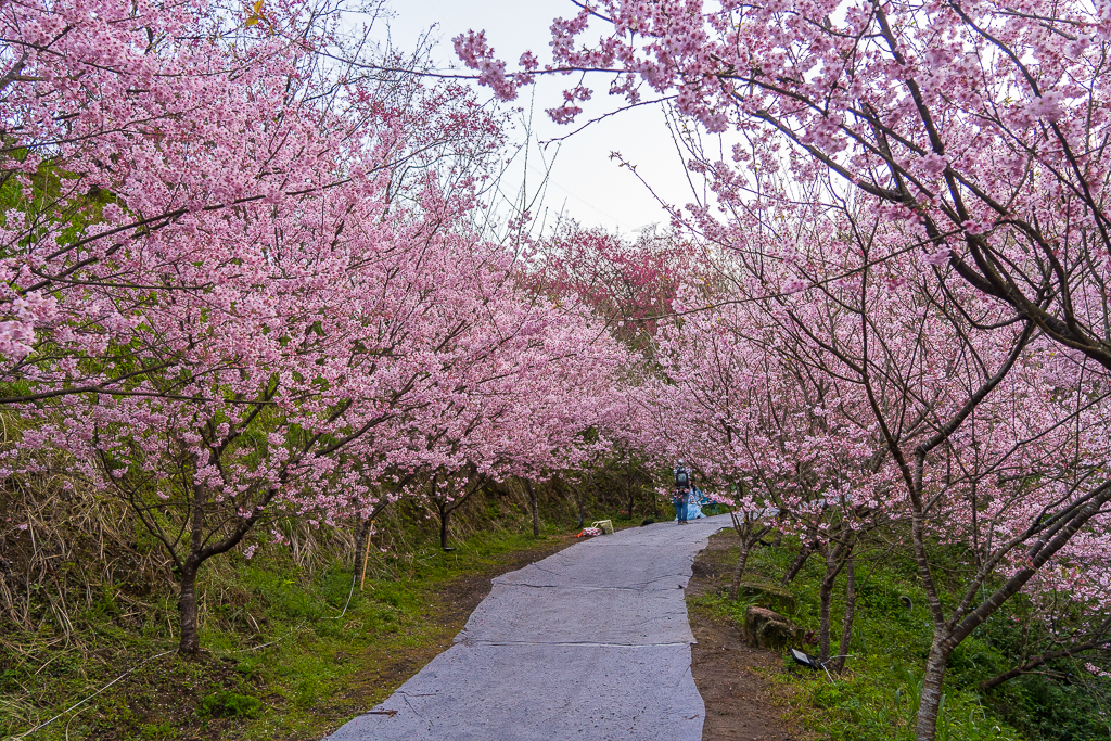 因為很早起, 開園就馬上進來, 立馬爬坡走到香水櫻的櫻花隧道處, 早上來的好處就是沒有"滿滿"人潮, 比較有機會能到拍到空景 (當然我說的是真的很早來, 開園前就到達), 看到滿滿的矮矮的兩排香水櫻的櫻花步道, 真是美翻惹